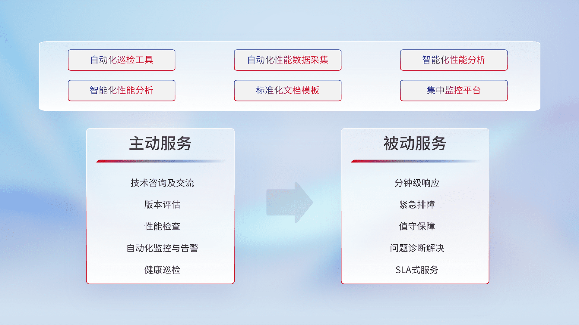 智能化工具和标准化文档,,,,保障服务质量,,提供主动服务(包含技术咨询、、版本评估、、性能检查、、自动化监控与告警、、健康巡检)和被动服务包含(分钟级响应、、、、紧急排障、、、、值守保障、、、问题诊断解决、、、SLA服务)。。。