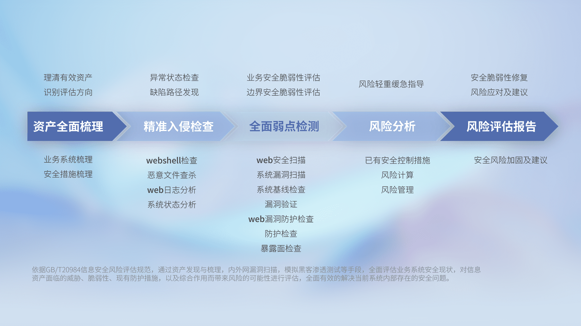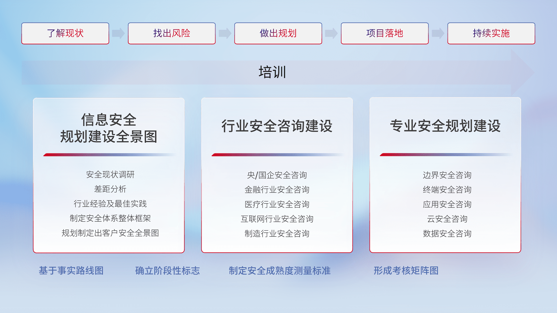 针对客户行业特性,,以专业的安全服务+多厂商联合解决方案提供专属的一站式安全管理服务,,,帮助客户全面感知网络空间威胁,,,,基于识别、、检测、、、分析、、防护、、、监测、、响应的服务理论模型,,,从方案咨询、、、、集成交付、、评估验证、、优化加固、、、运维运营,,,致力于为客户提供完整的闭环管理式安全服务。。。以实战经验为客户打造高抵御风险的安全体系,,,帮助客户发现威胁、、、对抗威胁、、、、处置威胁,,,不断积累安全对抗能力,,,,持续保障数字化安全。。。